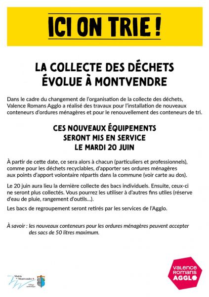 L'Agglo Valence Romans assure la collecte et le traitement des ordures ménagères, la collecte et la valorisation des déchets recyclables, la gestion des déchèteries et la gestion des conteneurs. Après la collecte, les déchets sont envoyés en partie au Syndicat de traitement des déchets Ardèche-Drôme pour être traités et recyclés. Elle mène également des actions de sensibilisation et de prévention. L'ensemble de ces services est financé par la Taxe d'enlèvement des ordures ménagères (Teom) et la Redevance spéciale (RS) pour les établissements professionnels produisant entre 2 et 10 m3 par semaine d'ordures ménagères résiduelles assimilées.
